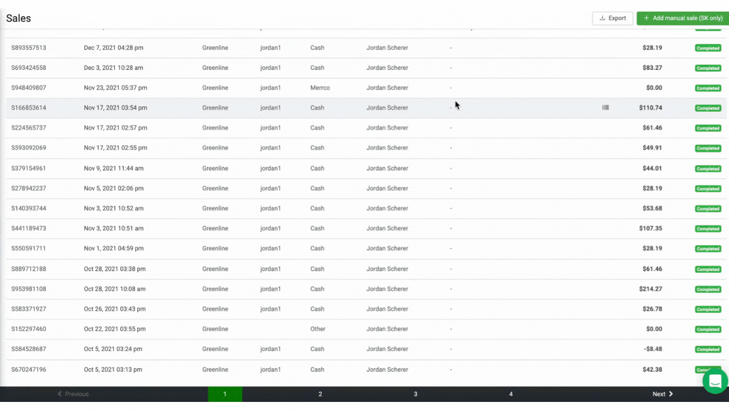 Get an overview of all the sales that have occurred in your BLAZE POS in the Sales > Sales List section on your Dashboard. Users can select multiple locations and date ranges if necessary. You can view the sales ID, POS device, payment type, employee name, and more.