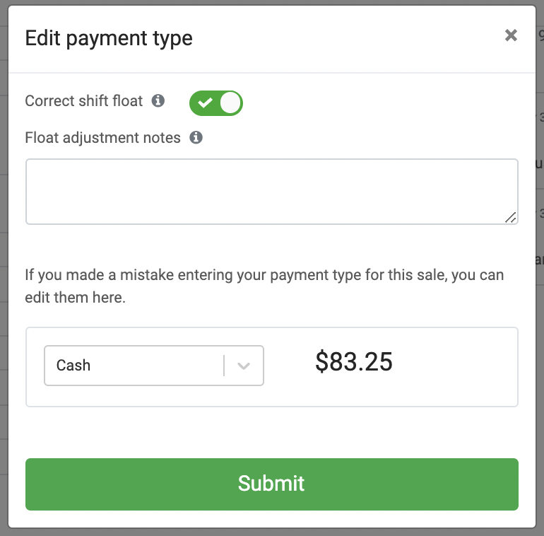 When changing the payment type, you can choose tovcorrect the shift float, add float adjustment notes, edit payment quantities, and change the original payment type(s).