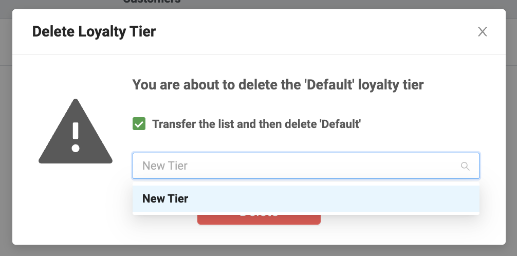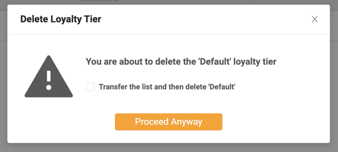 A pop-up will appear asking if you want to proceed with deleting the tier or transfer it to a new loyalty tier. If you would like to add a new tier, check the box and a dropdown will appear