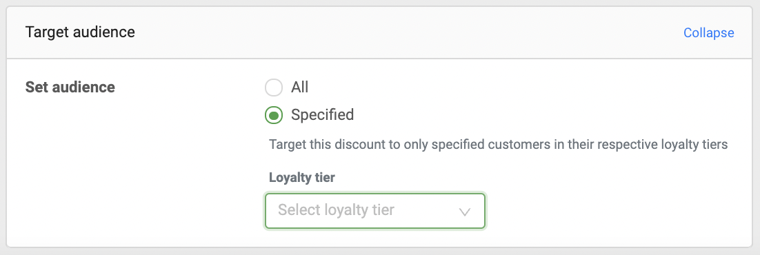 Under the target audience section, select specified > choose which loyalty tier you would like the discount to be added to from the dropdown menu