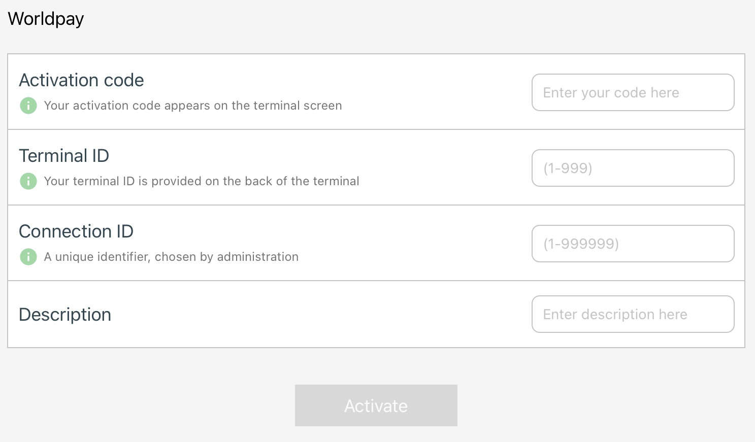 Once these fields have been added, you will be able to add acceptor IDs for each location. These acceptor IDs will be used on the POS to establish a connection between the terminal and the system. Acceptor ID will be provided by Worldpay.