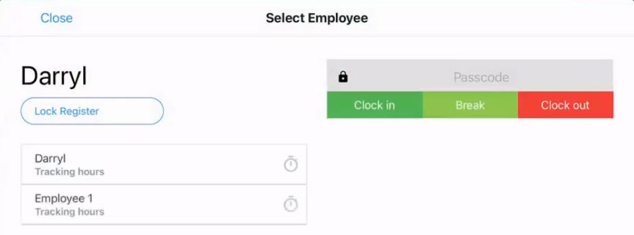 Employees can enter in their passcode and tap on "Clock in" to begin tracking their shift sales. When employees take their breaks or clock out, they can enter in their employee passcode and tap on the “Break” or “Clock out” buttons. To resume tracking sales, you will need to re-enter your passcode and tap on “Clock in”.