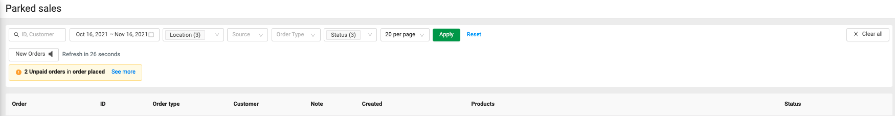 At the top of your screen, you will see a quick summary of the order status' on your parked sale page. You can use the filters to help you navigate through the parked sales by customer, sales ID, time frame, locations, source, order type, and status.