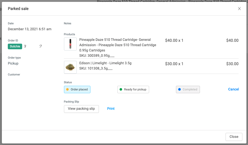 You will see the order in your Sales > Parked sales tab on your BLAZE dashboard. The "Order type" will populate as "Pickup"