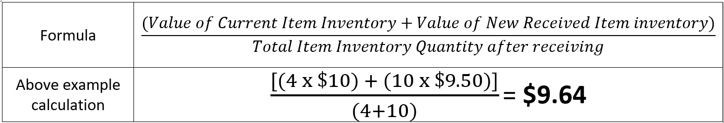The weighted average setting then automatically calculates and adjusts the cost per unit value of the product using this formula:
