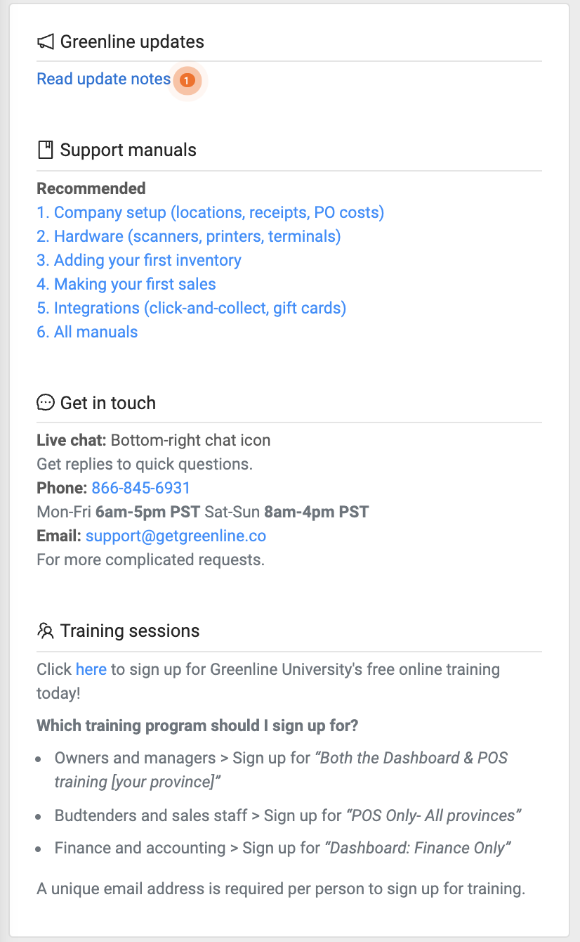 Training Sessions- Select "Click here" to sign up for Dashboard and/or POS training.