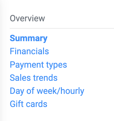 The Overview sub-section contains reports such as Summary, Financials, Sales Trends, Payment types, Day of week/hourly, and Gift cards.