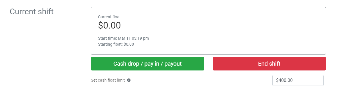 The current shift section outlines details pertaining to the your cash handling for the day. It includes an overview of your current float balance, the ability to set or adjust your float limit, cash drop / pay in / pay out functionalities for security and petty cash usage, and an option to end the current shift.