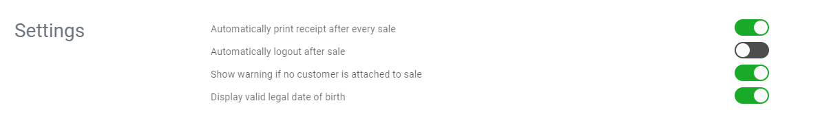 The settings section allows you to toggle various settings such as: print a receipt automatically after each sale, log your employee out after each sale for security purposes, show a warning if no customer profile is attached to every sale, and display the legal date of birth to purchase cannabis for easier ID validation.