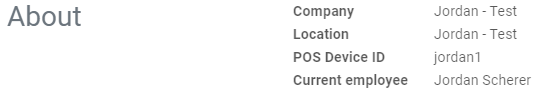 The about section includes a brief breakdown of your company, location, device ID, and which employee is currently logged in to your device.