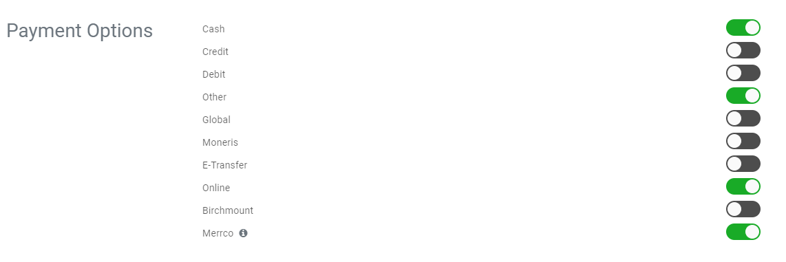 The payment options section allows you to toggle various payment methods between enabled and disabled.
