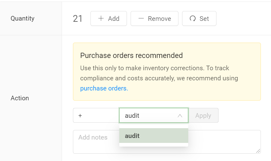 Important: All other inventory additions should be entered via the Purchase Order section in order to track compliance and costs accurately.