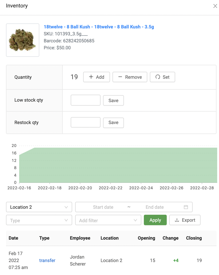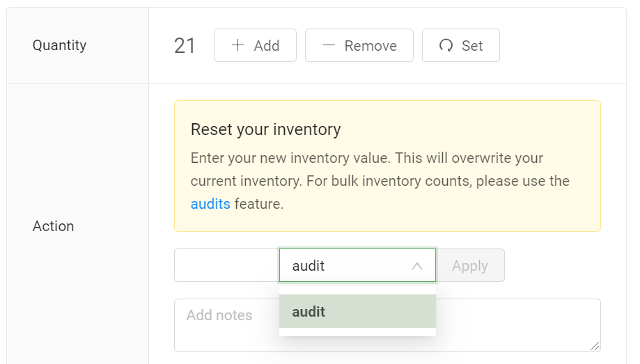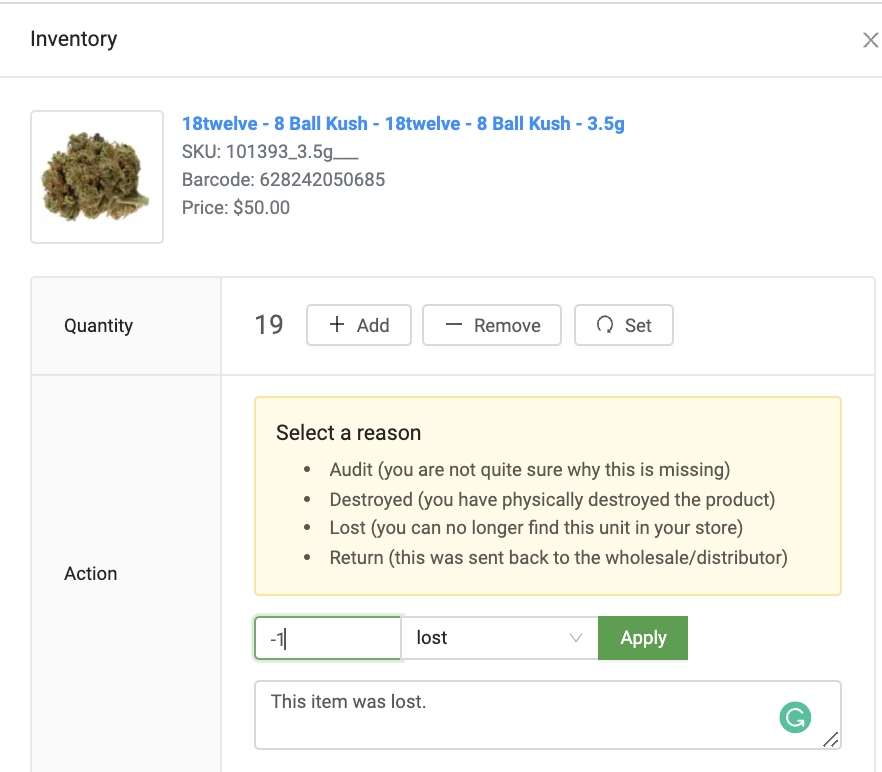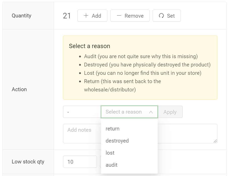 Click on the “Add, Remove or Set” button and enter the product quantity change.