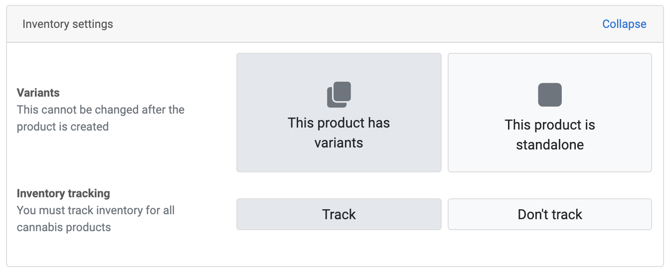 By default, inventory tracking is turned on for all products. This allows you to track physical products' (especially cannabis) inventory movements and add inventory quantities via purchase order.