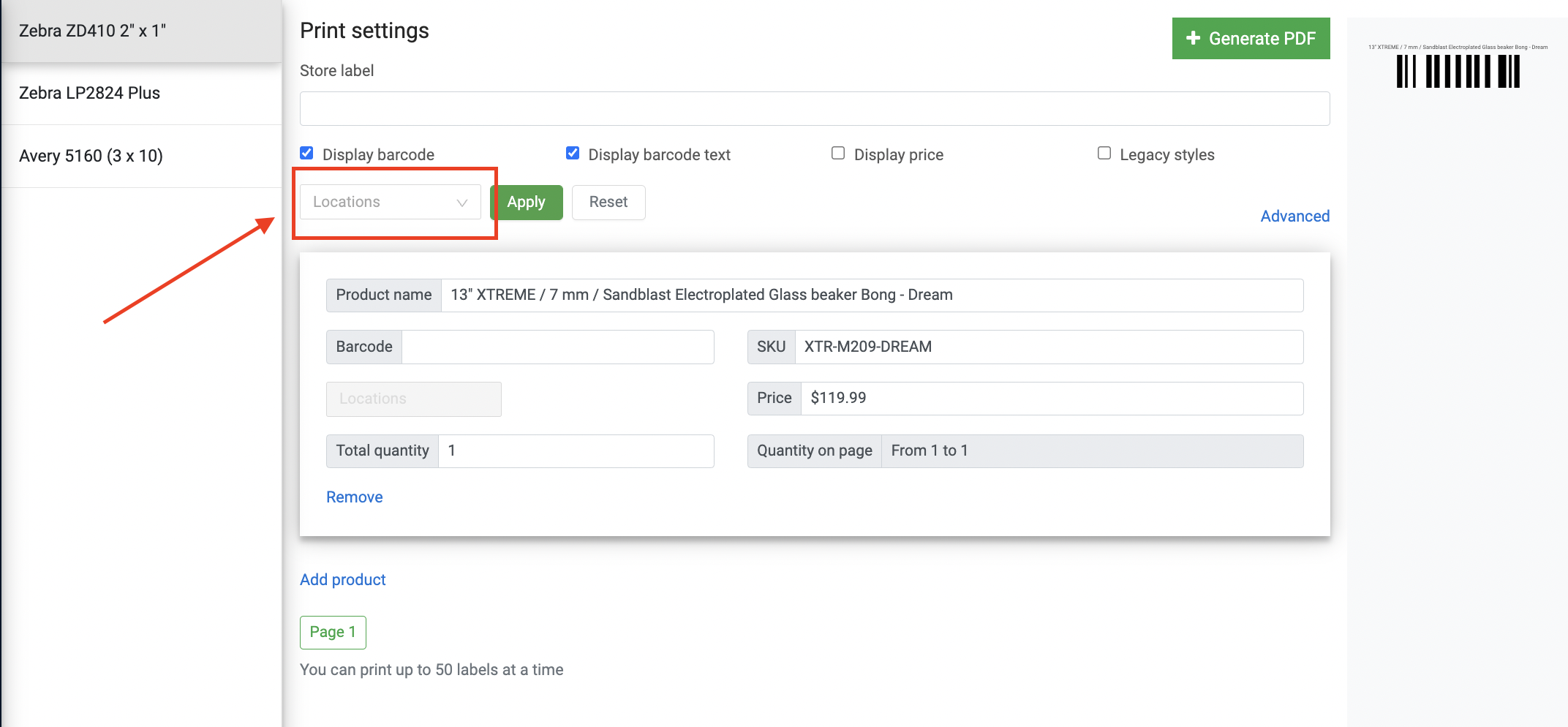 The settings should be set to the ZD410 by default. Enter in any additional fields (such as location name, or modify the product name if it’s too long), enter in the quantity, then click “Print” to generate the PDF. Once downloaded, simply print that pdf to the configured label printer.