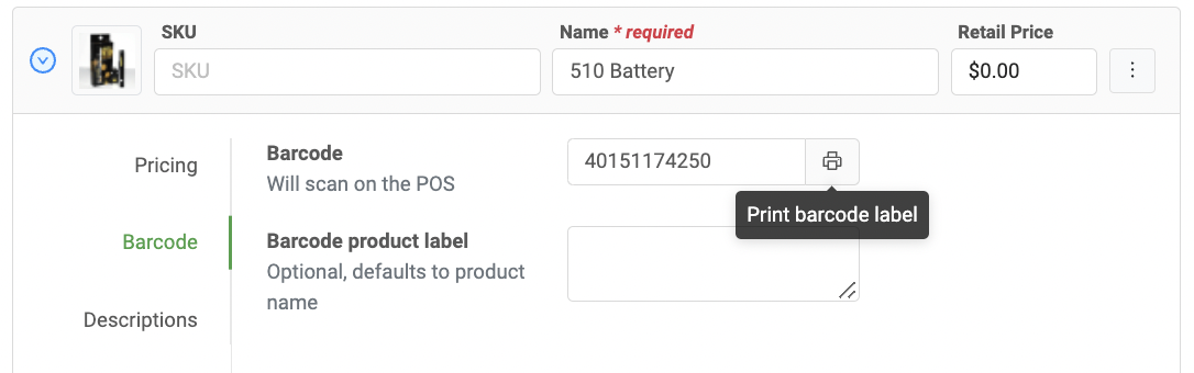 In the case that the products don’t have a barcode, click on the barcode symbol next to the barcode input to create one. You can then press “print” underneath to go to the label printing page.