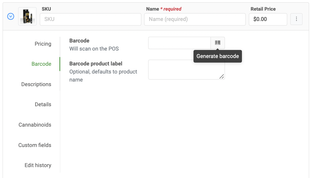 When your store sells products that do not come with barcodes on them, it is advised that your store generates and prints your own labels. When you create a product, we always recommend that the user scans the existing barcode into the barcode field using either a Bluetooth-paired Socket Mobile scanner or a USB scanner.