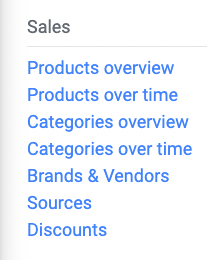 The Sales sub-section contains reports such as Products overview, Products over time, Categories overview, Categories over time, Brands & Vendors, Sources, and Discounts.
