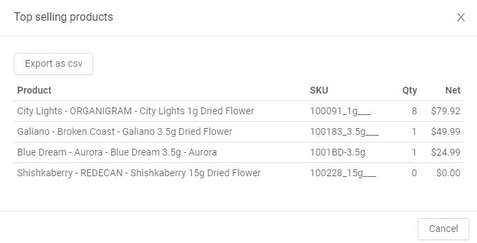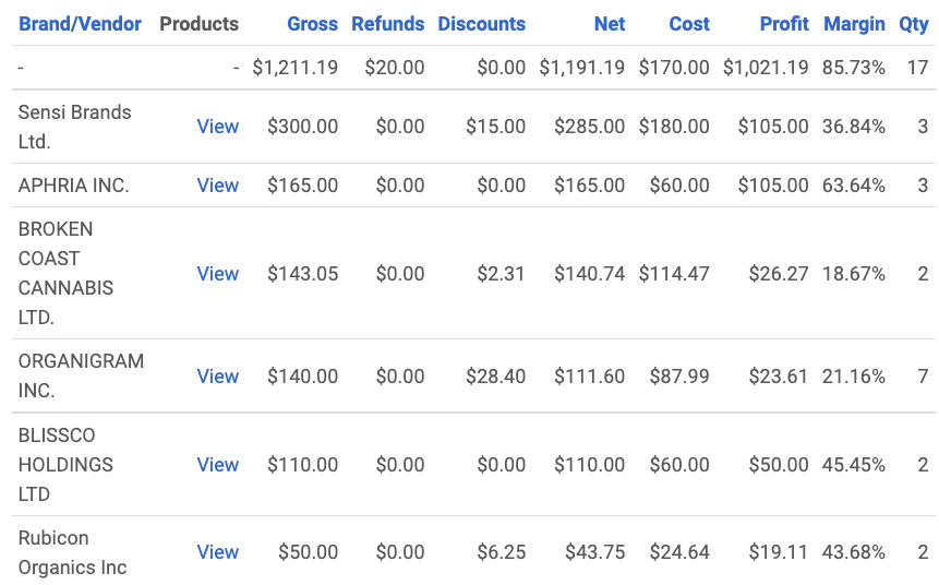 The Brands & Vendors section provides insights on brands/vendors and which of their products are generating sales. When you click on the “view” text next to each brand or vendor, a pop-up will appear with a list of their products, quantities sold, and sales. Users can select multiple locations and date ranges if necessary.
