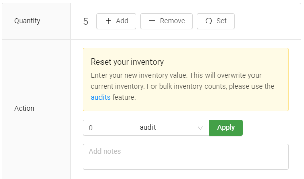 TIP: If you go to Inventory > Overview on your dashboard, you will notice that the placeholder location now has negative inventory for the SKUs that you just transferred over. If you would like to bring the inventory value to 0 simply click the cell with the value. This will bring you to an Inventory overview pop-up of the SKU. In the Quantity row, you are able to adjust the quantity by adding, removing, or setting the products. The simplest way to bring this to zero is by clicking the set button which will is located in the Action row. Here, you can enter 0 and click apply to bring the quantity back up. When conducting compliance reports do not include your placeholder locations in the reports as they do not carry actual inventory.