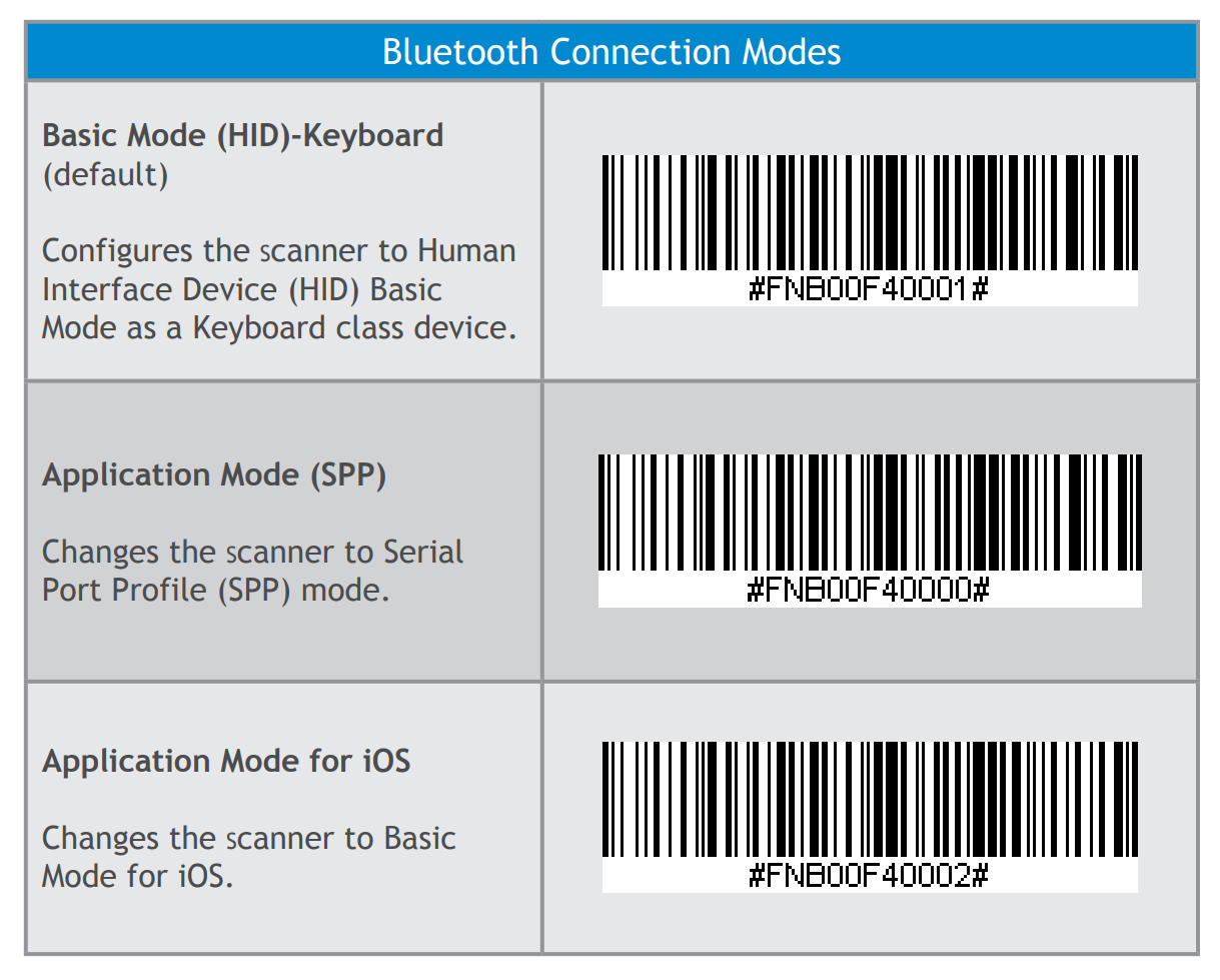 Reference the image below, and scan the "Basic Mode (HID)-Keyboard" barcode