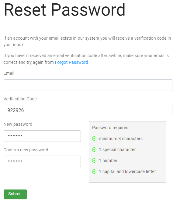 The link will direct you to the Reset Password page which will require the user to enter their: email, verification code (from the email), and new password. Click submit to initiate the changes.