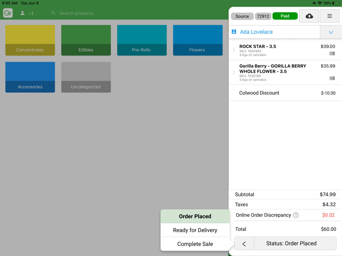 At the bottom of the cart, you can view sales subtotals, and online order discrepancies (if available).