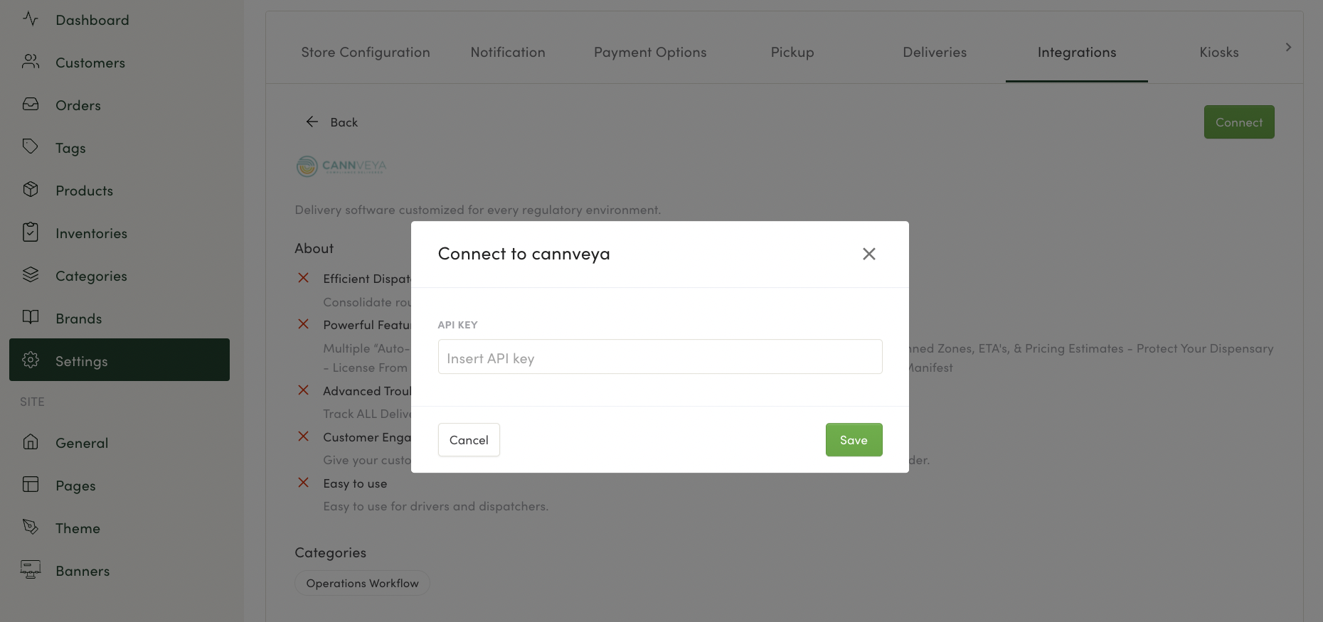 Set up the Tymber + Cannveya integration by navigating to Settings > Integrations > Cannveya and insert your Cannveya API key.