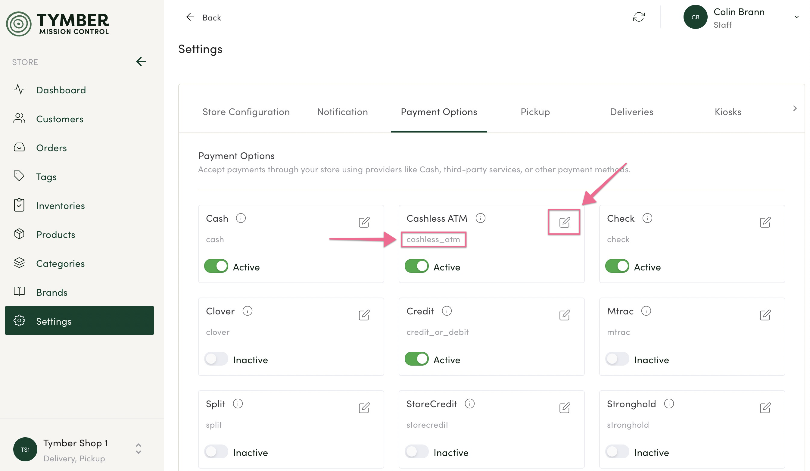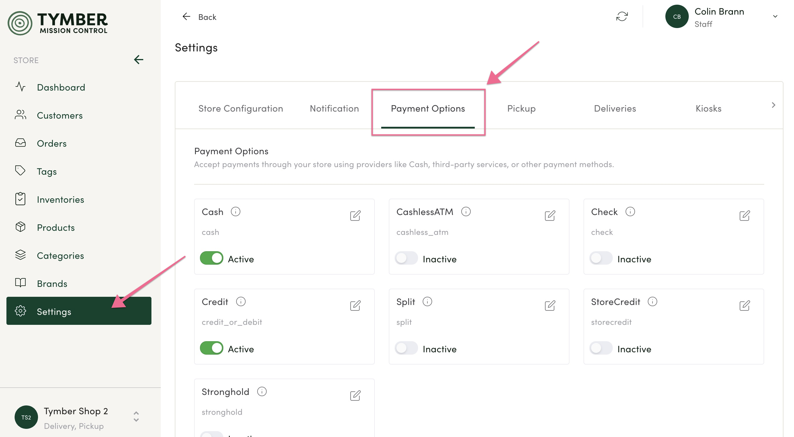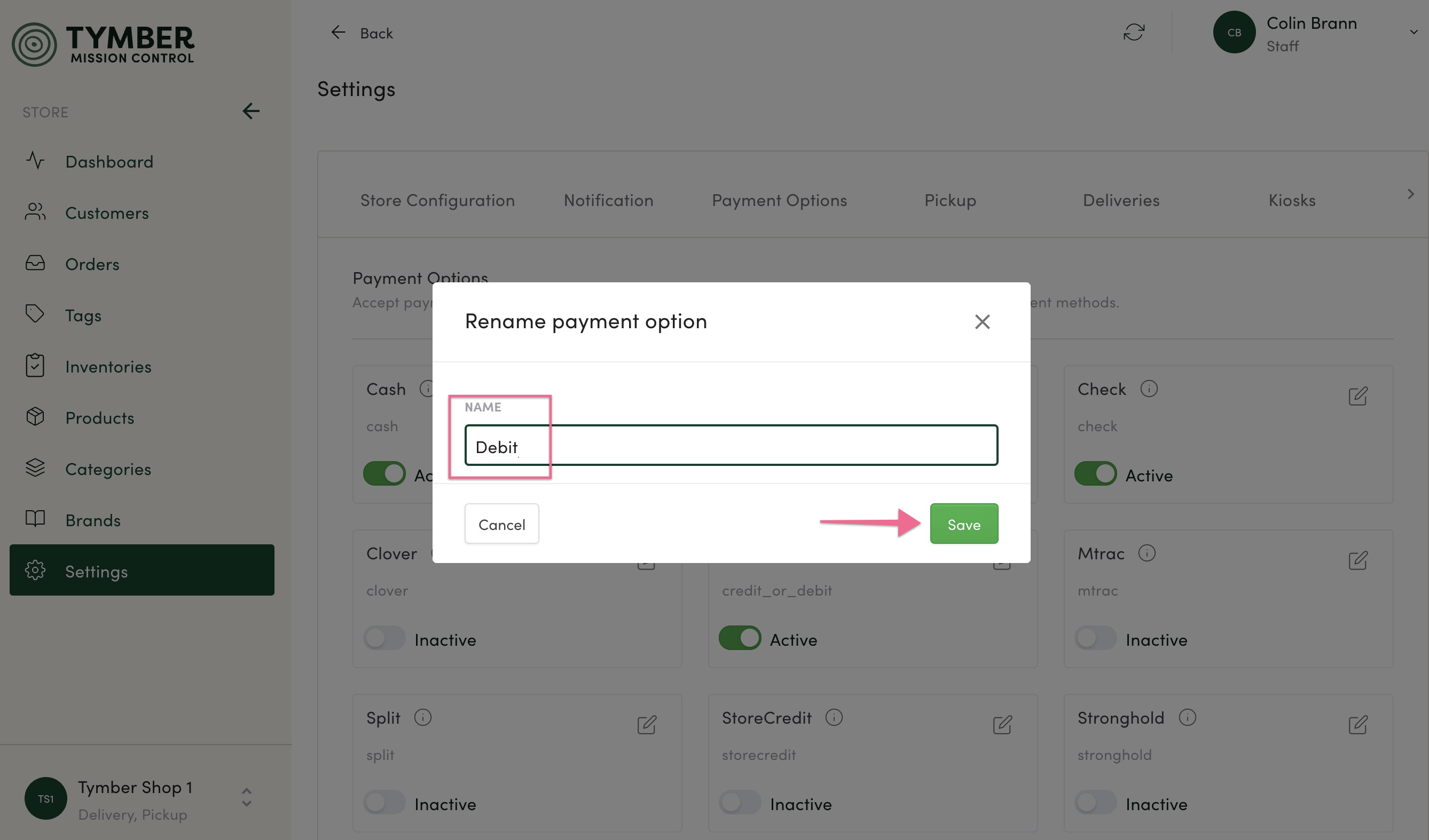- Payment Options must be enabled in the POS to be made active in Tymber Mission Control.