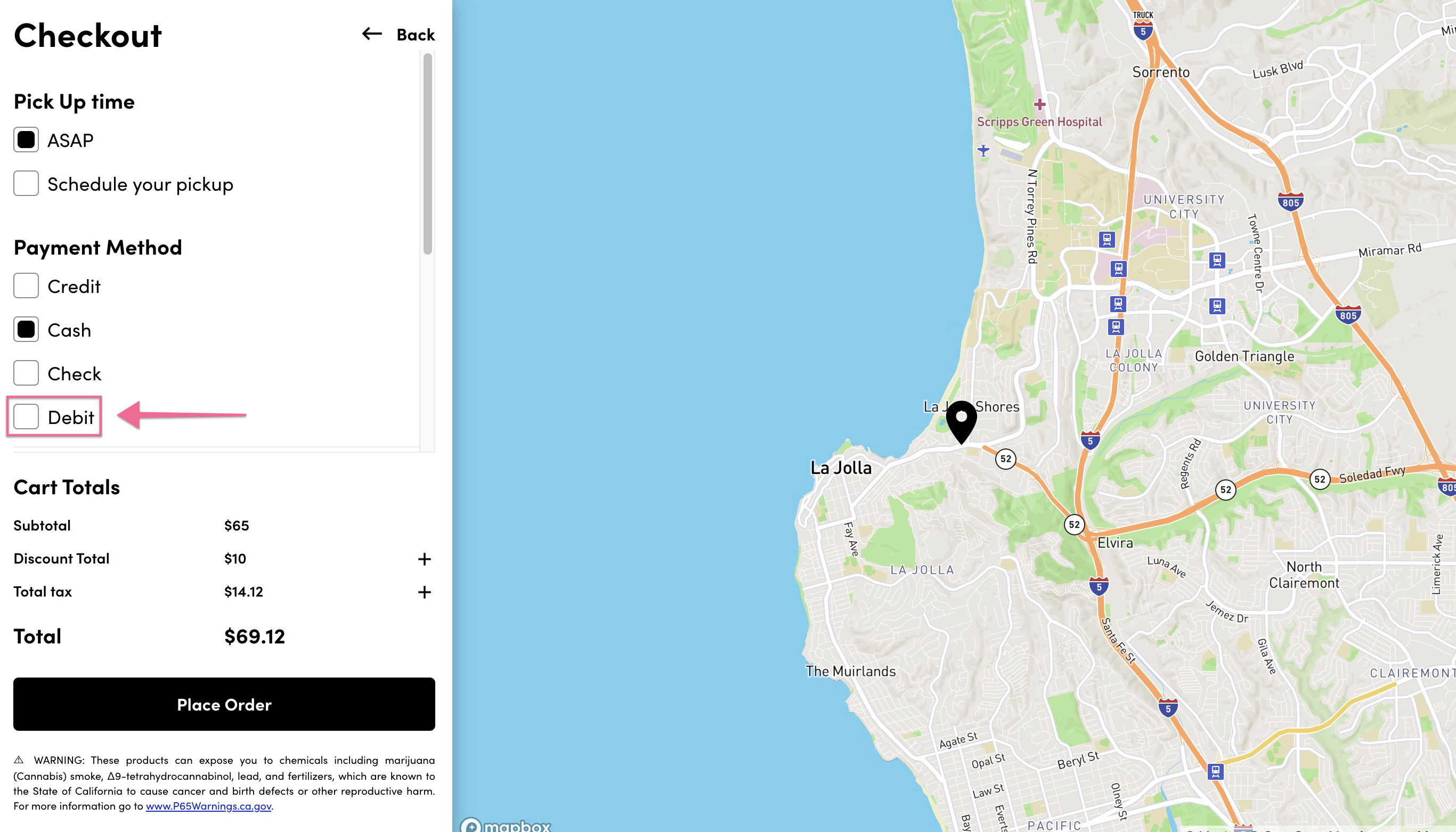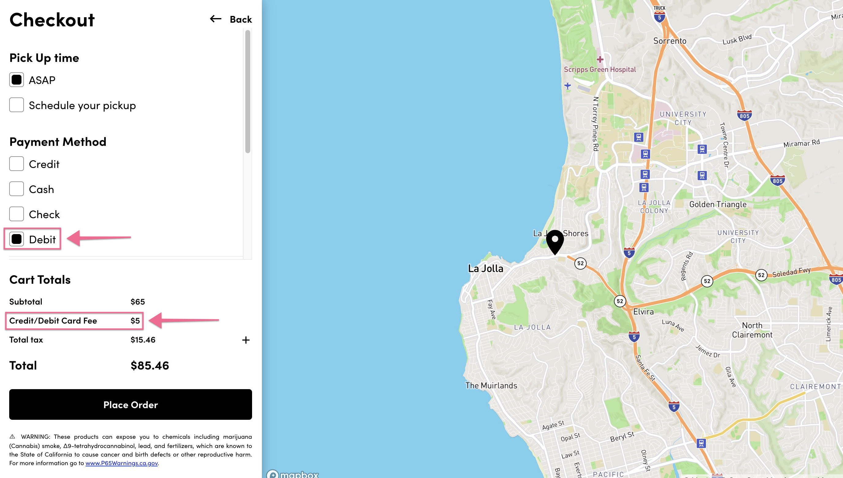 - Optional fees that are setup in the Point of Sale for each payment option are also visible to customers in the checkout process. For example, there is a $5 fee assigned to the cashless_atm payment option, which we have renamed to Debit. The fee is automatically added to the Cart Totals when Debit is selected for payment.