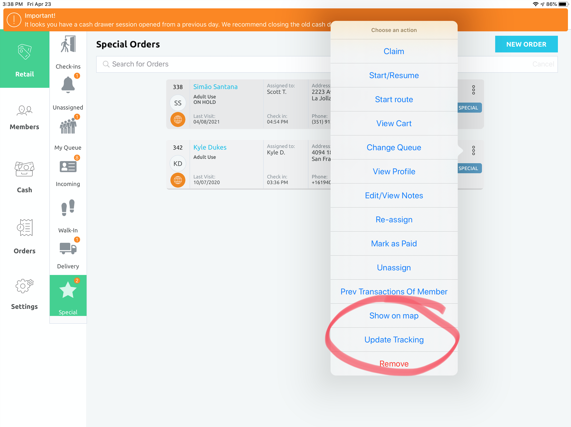 - The order will now be the Delivery tab and will be fulfilled/packaged for delivery. When the order is ready to go out for delivery, click the Select Action dropdown and select Update Tracking Status.