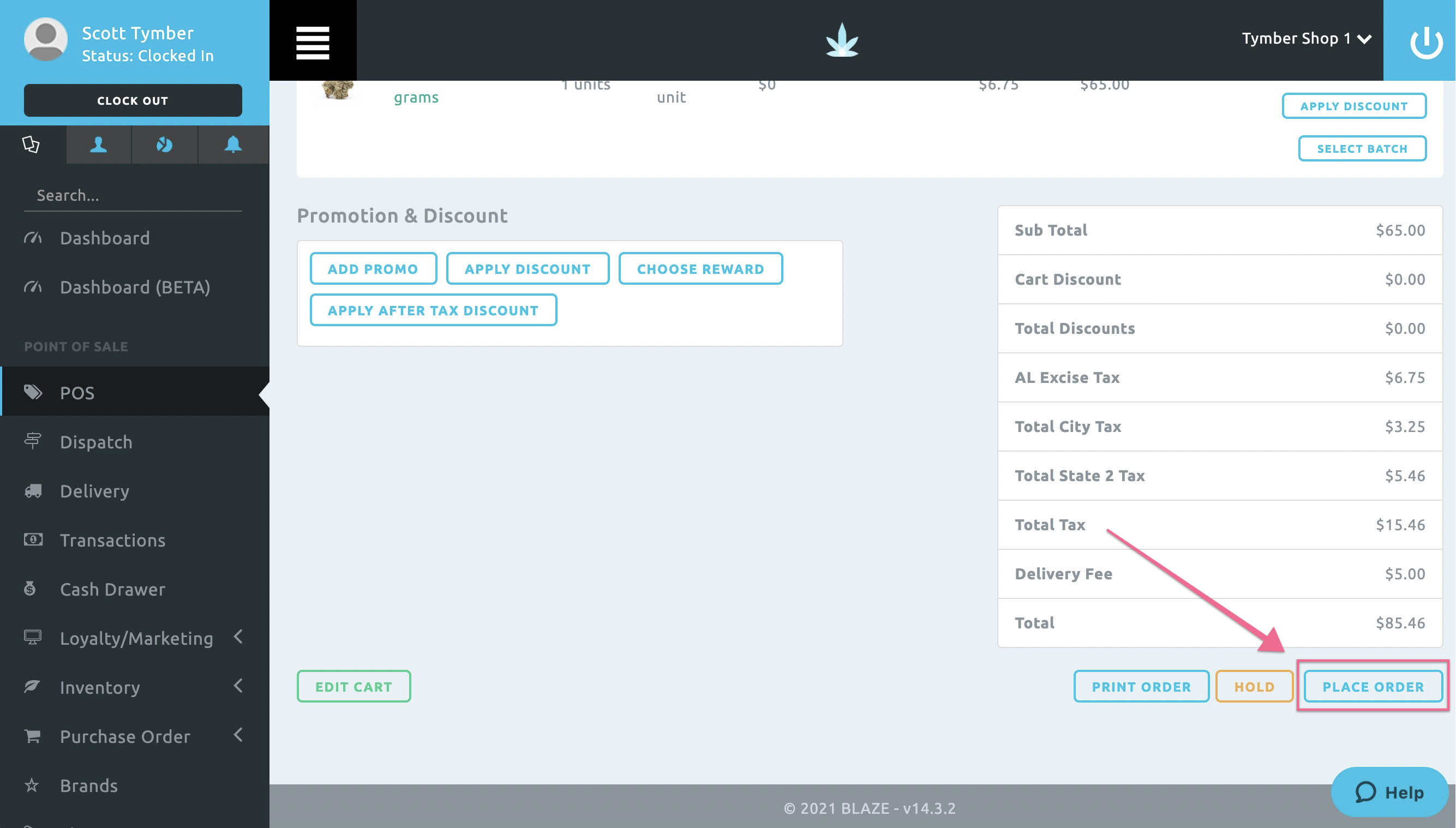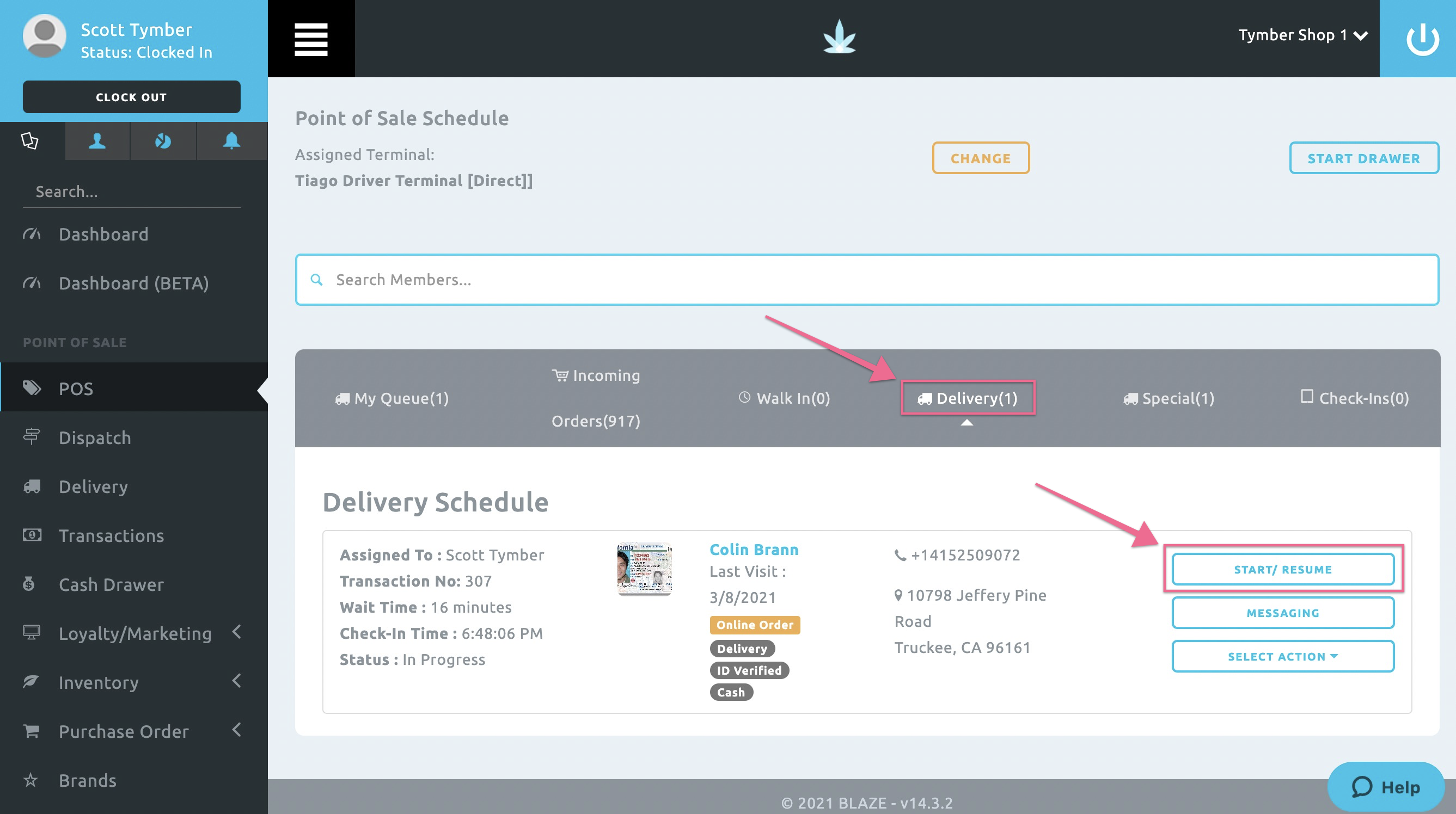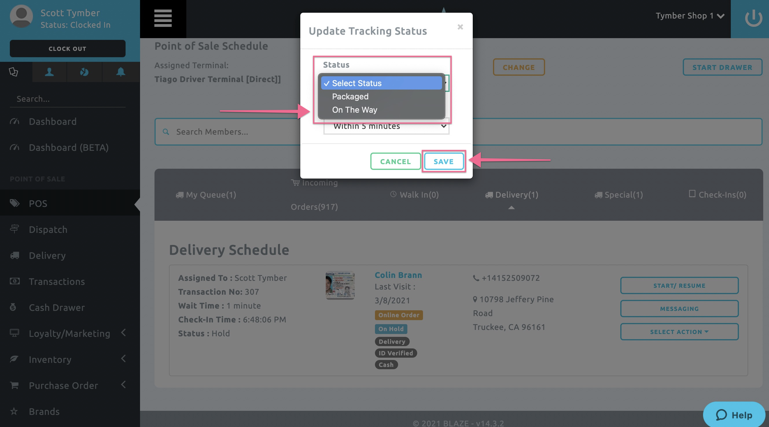 - The Delivery Order On the Way SMS Notification must be triggered directly from the Blaze Point of Sale. Log into the Blaze POS at app.blaze.me, click on the POS tab and click Accept Order on the incoming order.
