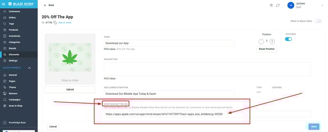 2. Add the unique menu URL in the SHOP NOW BUTTON URL field and save.