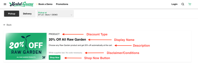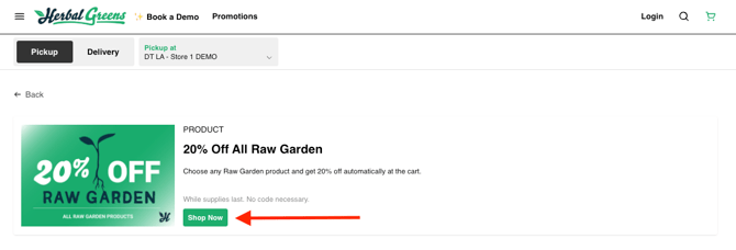 The "Shop Now" button is a way to add a clickable button to any Deal Card in your "Deals Page" on your ECOM menu that allows your customers to access the promoted deals directly. This allows for an easy addition of promoted products to your customers" shopping cart.