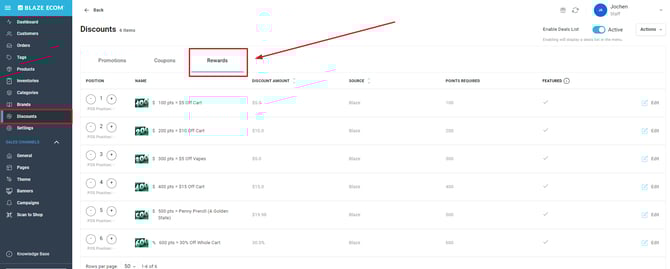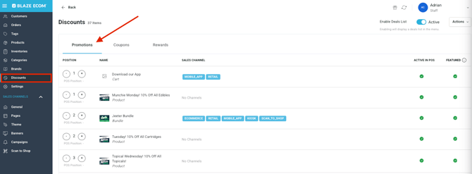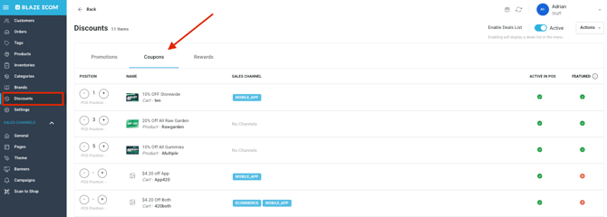 Once you have created and set up the "Deals Page" (as outlined above) please go to your "Discounts" tab on your BLAZE Mission Control Dashboard. Here you are able to view all your Promotions, Coupons, and Rewards that sync from the POS.