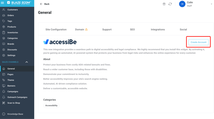 - Click Create Account and follow prompts to sign up for an accessiBe account. You will want to configure your primary domain to the accessiBe account for the widget to connect and display on the ECOM menu.