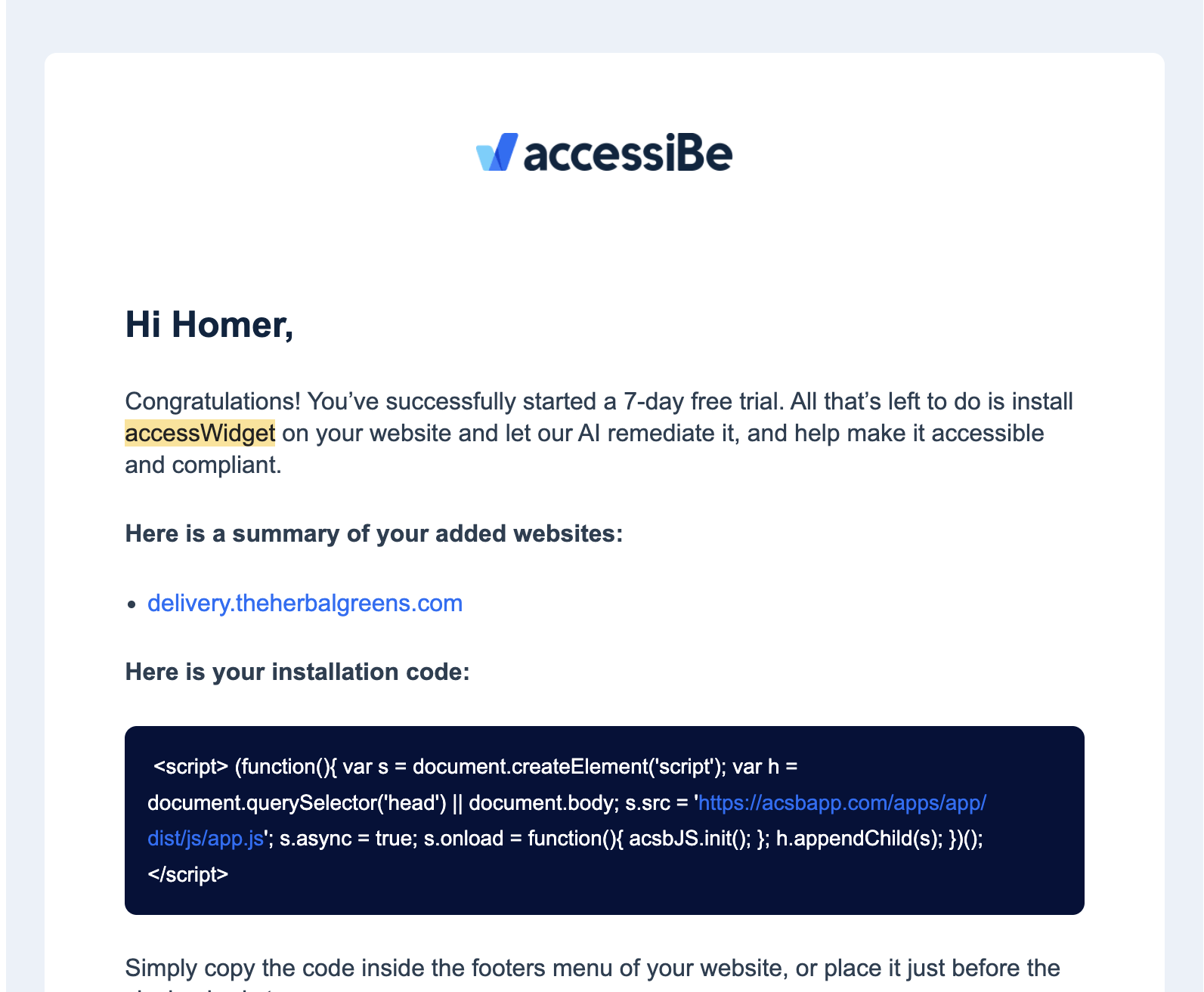 - You'll receive a confirmation email from accessiBe, which you can use the included code to install into your content website.
