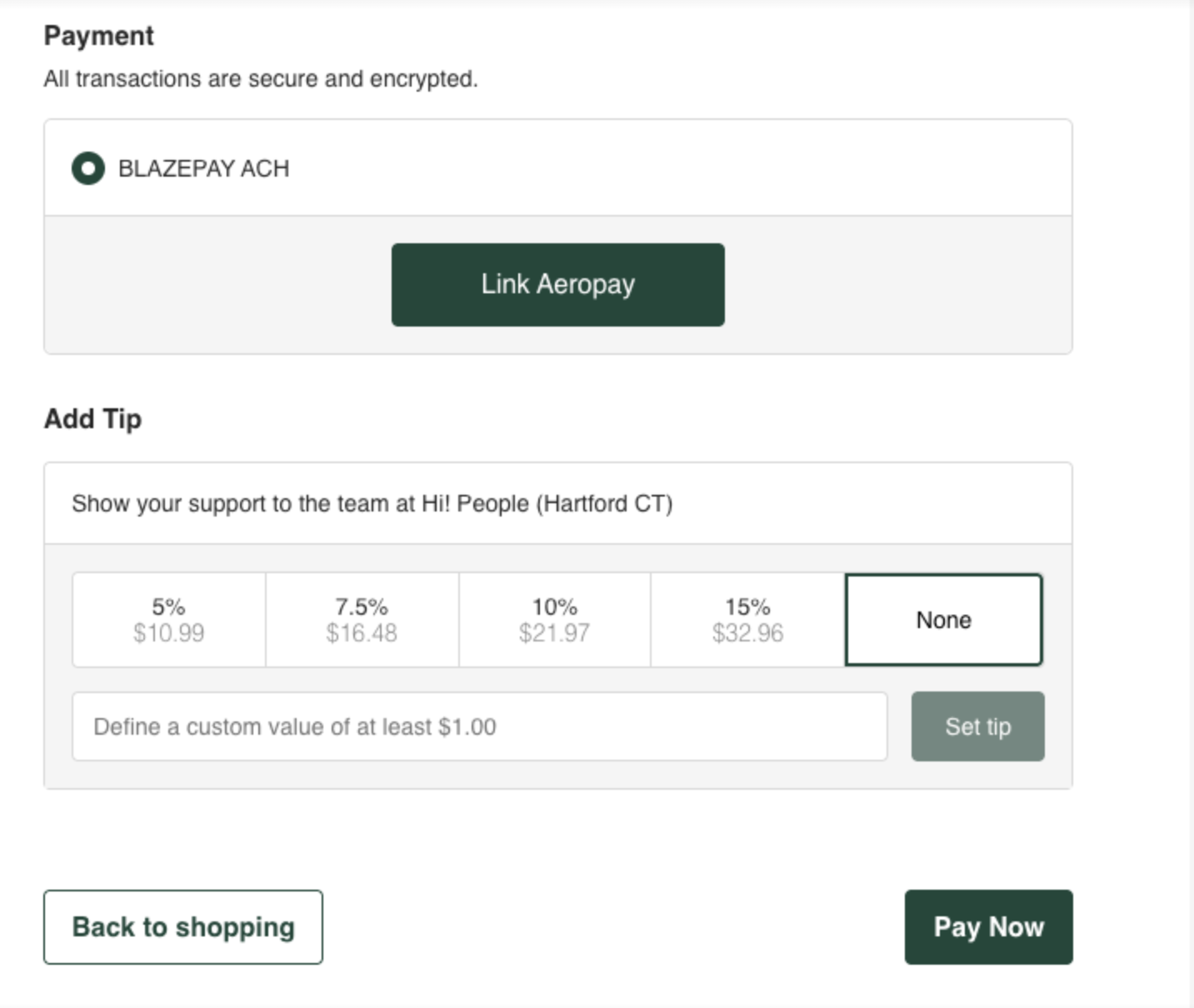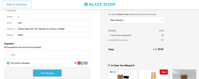 - When fully configured and enabled in Retail POS and ECOM Mission Control, Aeropay will display in the ECOM checkout as an available payment option.