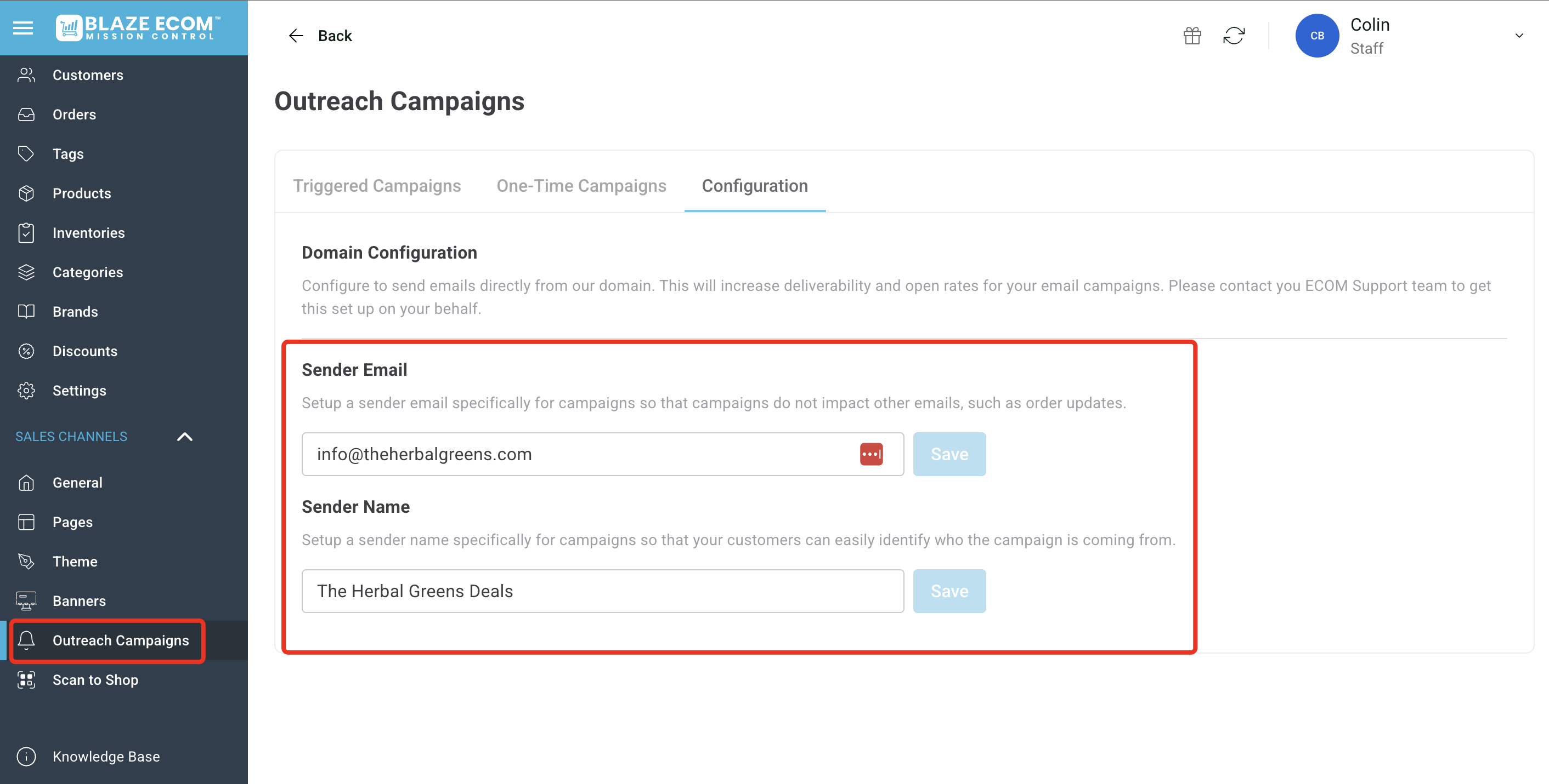 - Once domain is verified, head to Mission Control -> Outreach Campaigns -> Configuration and configure sending Email and Email Name: