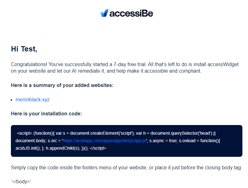 - Once you have signed up and activated an account with accessiBe, you should receive an email with your installation code.