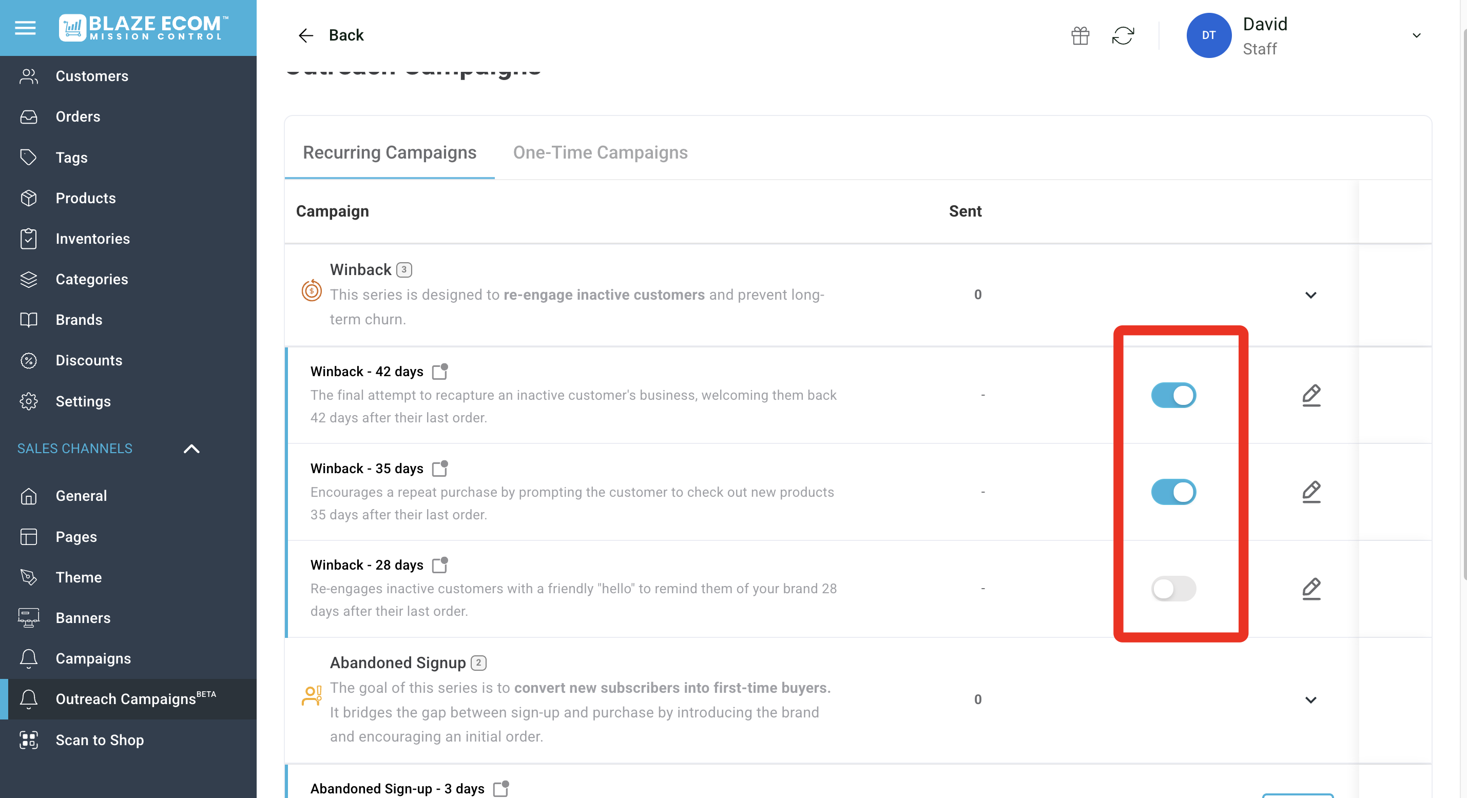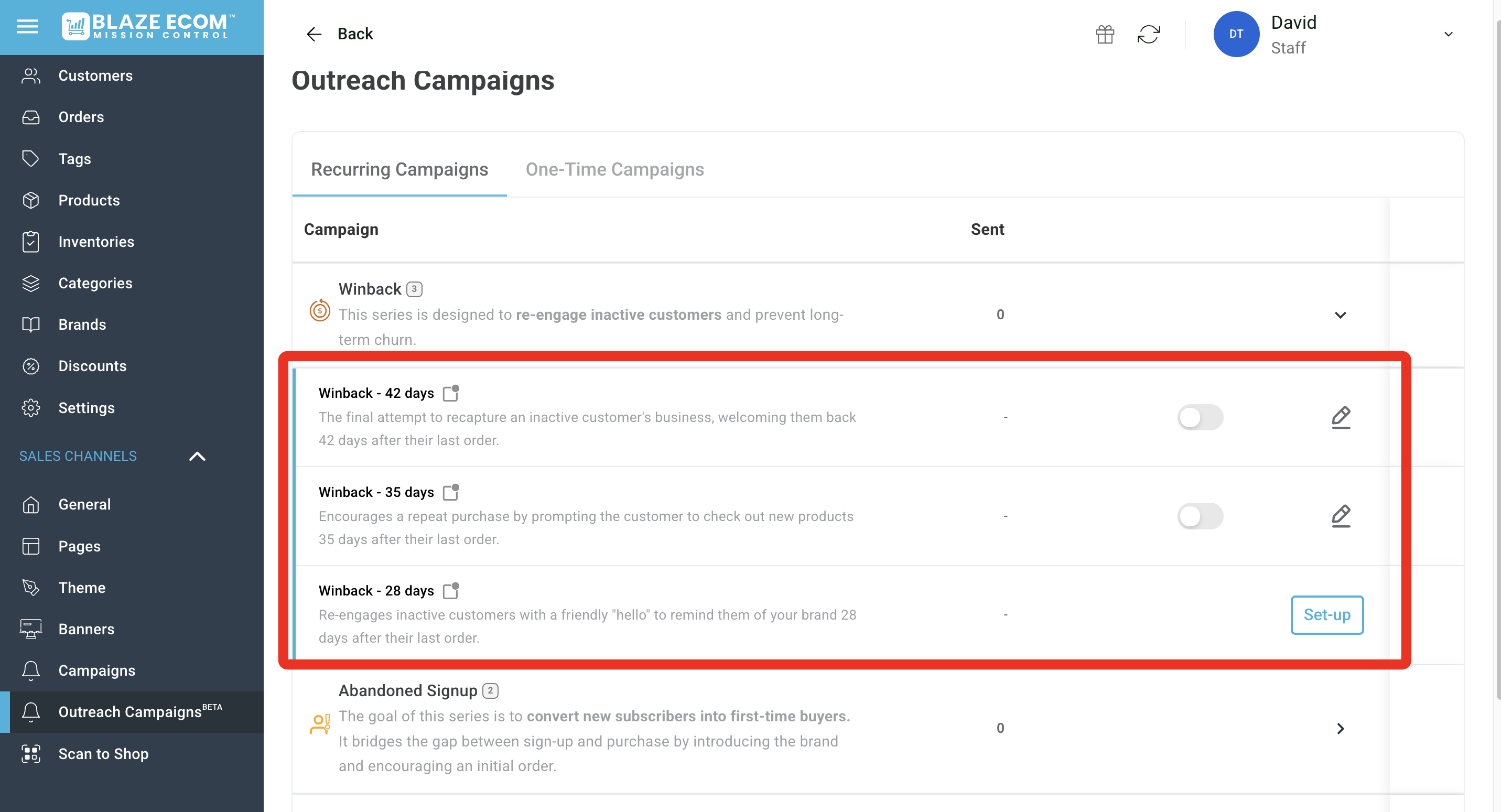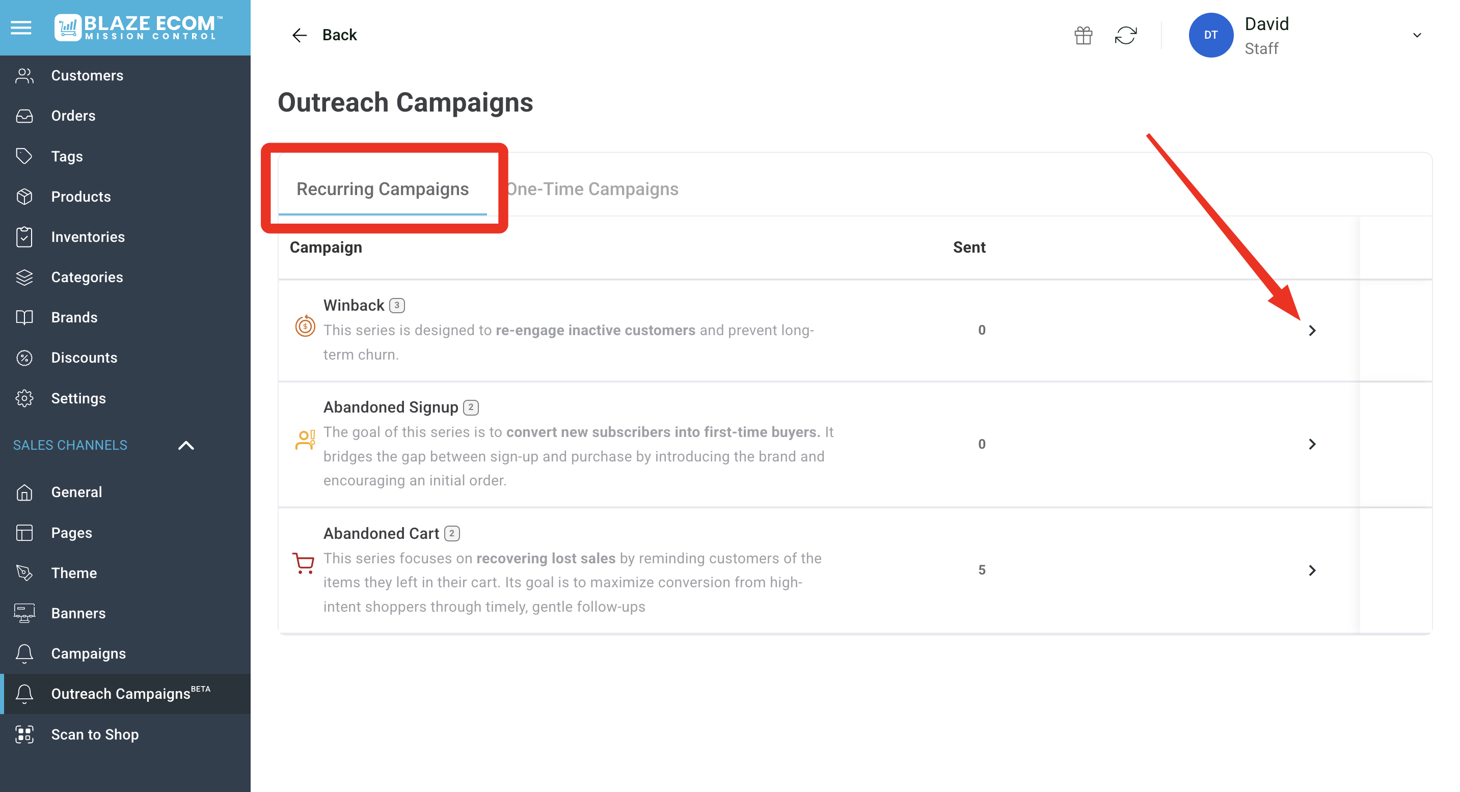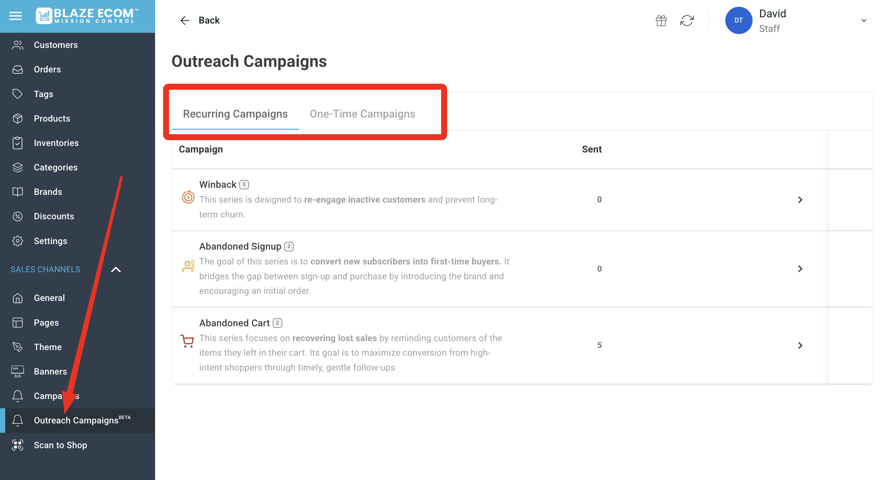 Within ECOM Mission Control, find "Outreach Campaigns" at the bottom of the sidebar menu. Once inside, you can select between Recurring Campaigns and One-Time Campaigns.