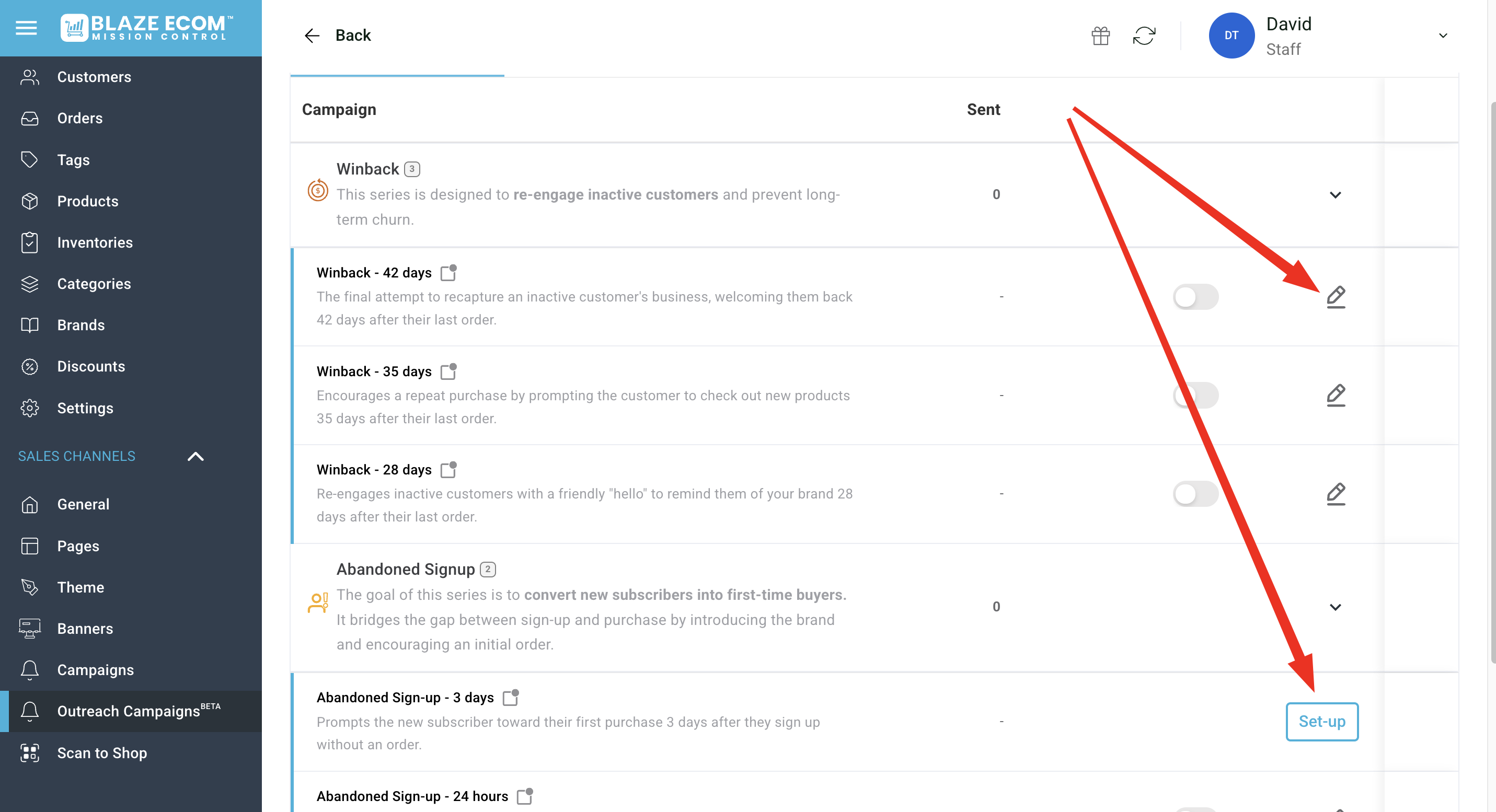 Click the pencil icon on the right of each campaign. If editing a campaign for the first time, you will need to click the "Set-up" button.