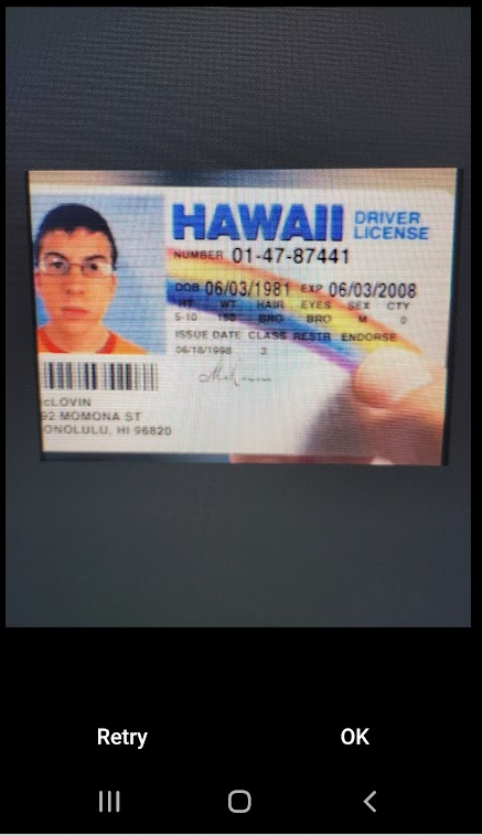 - Once you take the photo, you will be shown the photo and asked if the photo is OK or Retry.