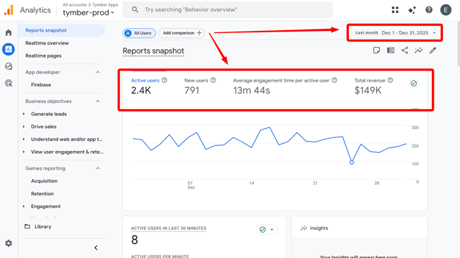 5) You will see a box highlighting your Active Users, New Users, Avg Engagement Time, and Total Revenue based on the set time period (top right)