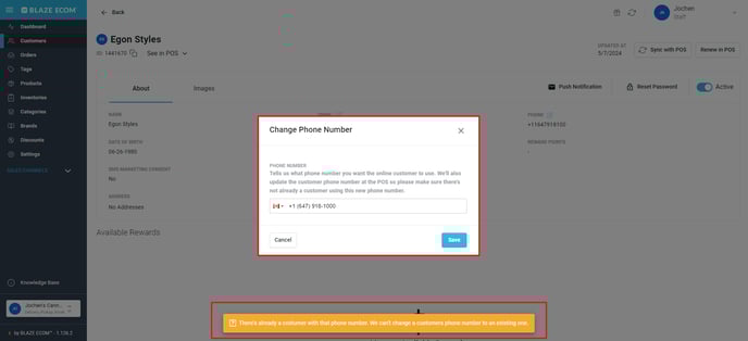 In case a customer profile is to be updated with an email address or a phone number that already exists under another customer's profile, the system will create an error message: