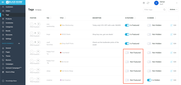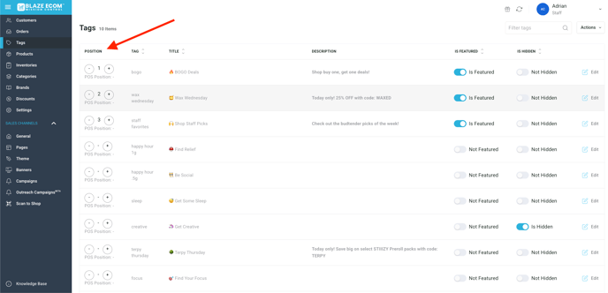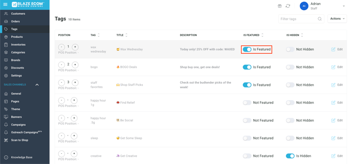 To create and edit a featured section on your store with a tag, login to your ECOM Mission Control at ecom.blaze.me