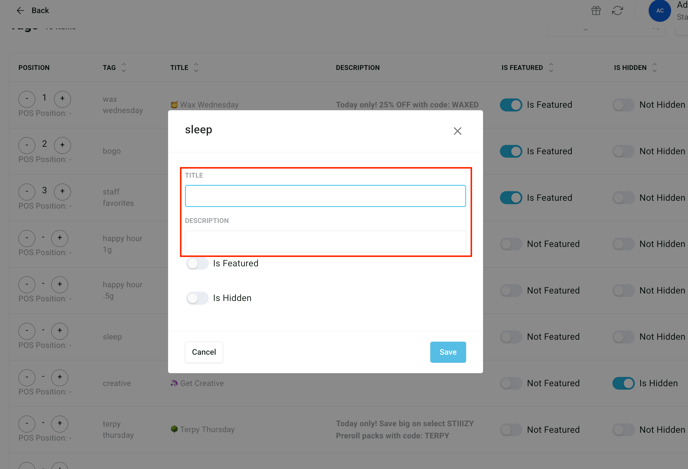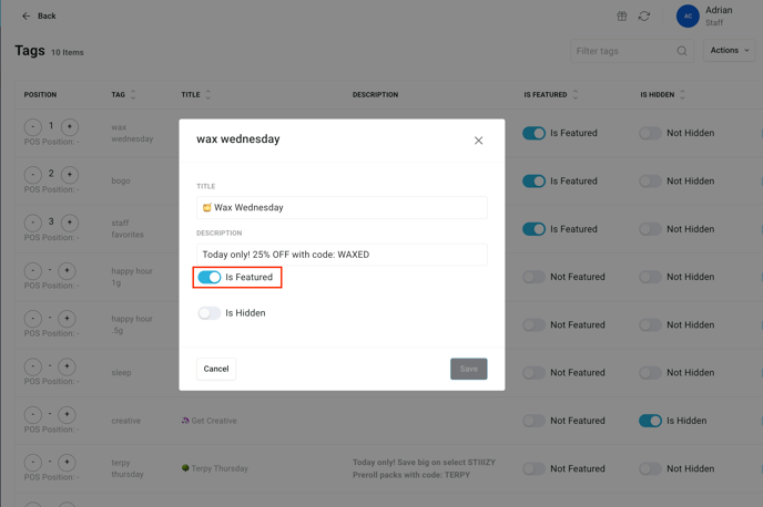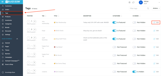 - Click on the Tags tab to view tags that have been created and synced from the POS. Tag Titles and Descriptions can be edited and toggled between Is Featured/Not Featured by clicking on the Edit button to the right of the tag row.