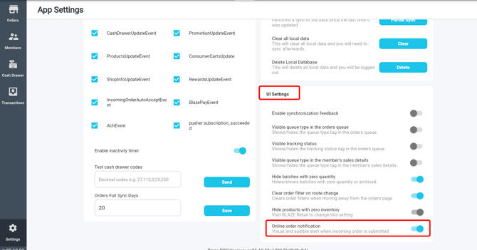 - Under UI Settings, enable Online Order Notification setting. This setting is enabled by Default for any device that is used to log into the WebPOS App.