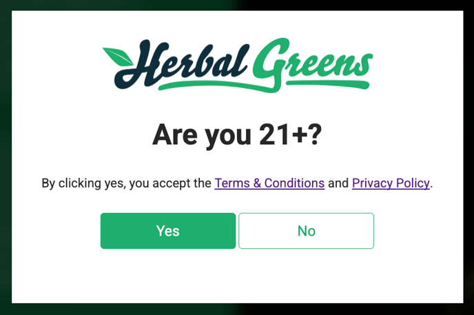 The Age Gate widget appears on the site to verify a visitor’s age before granting access to content. Depending on configuration, it can also include a store selection dropdown, allowing users to choose their preferred store location directly from the widget.