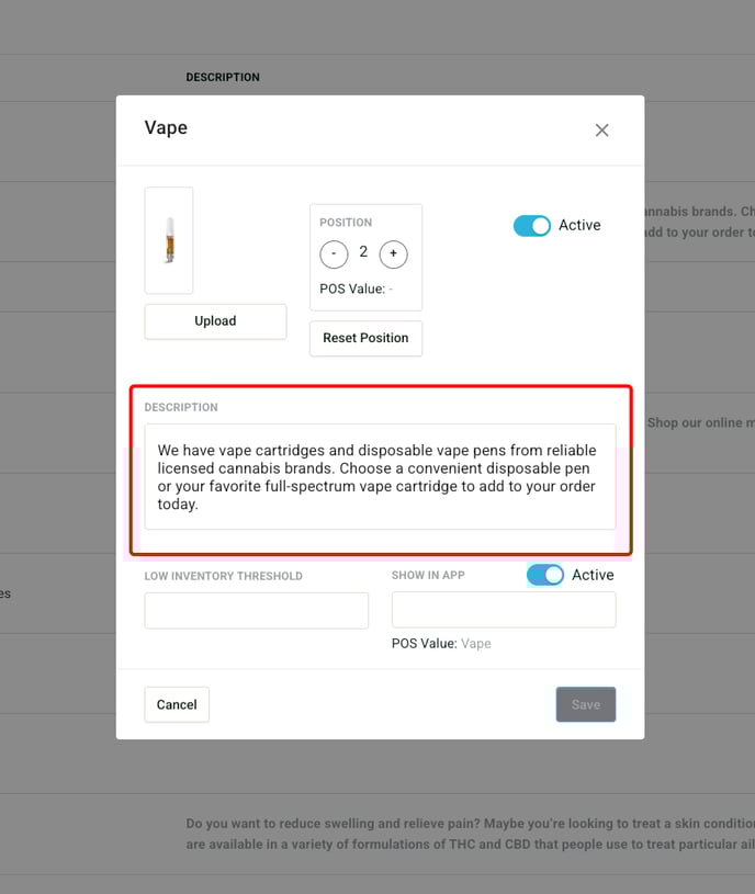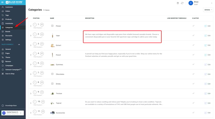 Once inside Categories click on the edit field to open up a modal where you can enter the description you want for that category. Once you have entered the description click save.
